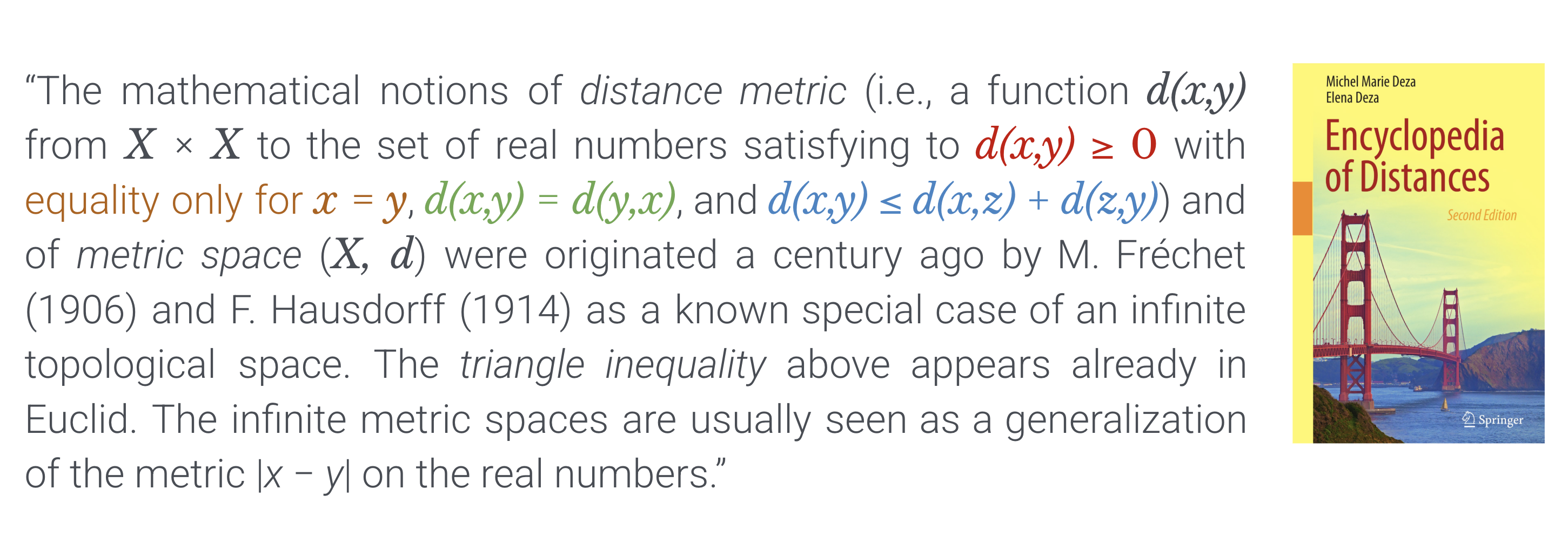 Deza & Deza’s Encyclopedia of Distances is the standard reference for this taxonomy and related notions.